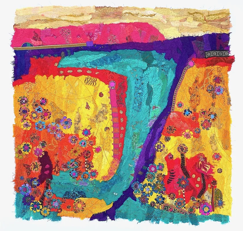 She further explains: “My process for this recent series of work has been to create a palette of newly invented silk cloth, felted using a dry felting embellisher, that turns some of my vast range of dyed silk via fusing and felting into fabric sheets. I then employed these as fabric collages to shape the fractured Vorticism influenced landscapes. Using this technique helps drive and inform the dynamism of these freshly abstracted landscapes. The quick mark making achievable with paint I am able to translate through free machine stitch to create a distressed stitched line that generates less surface visibility by being buried in the construction of the pre-fabric. This allows me to ‘draw’ the rhythm of the composition but only hint at what ‘could be’ in the landscape for the viewer.”